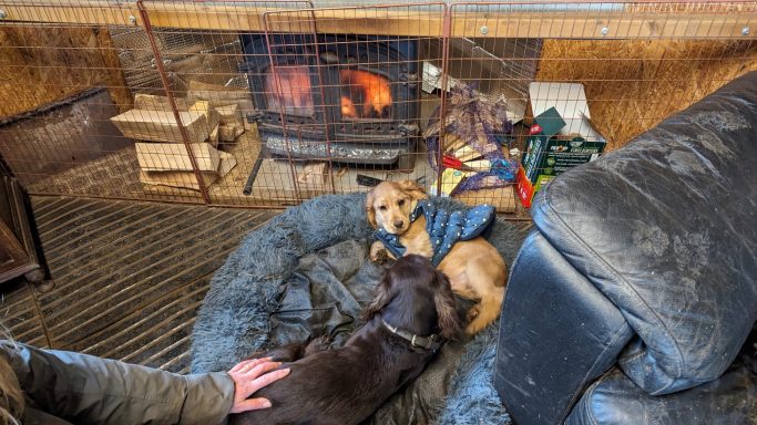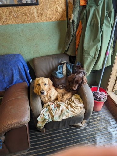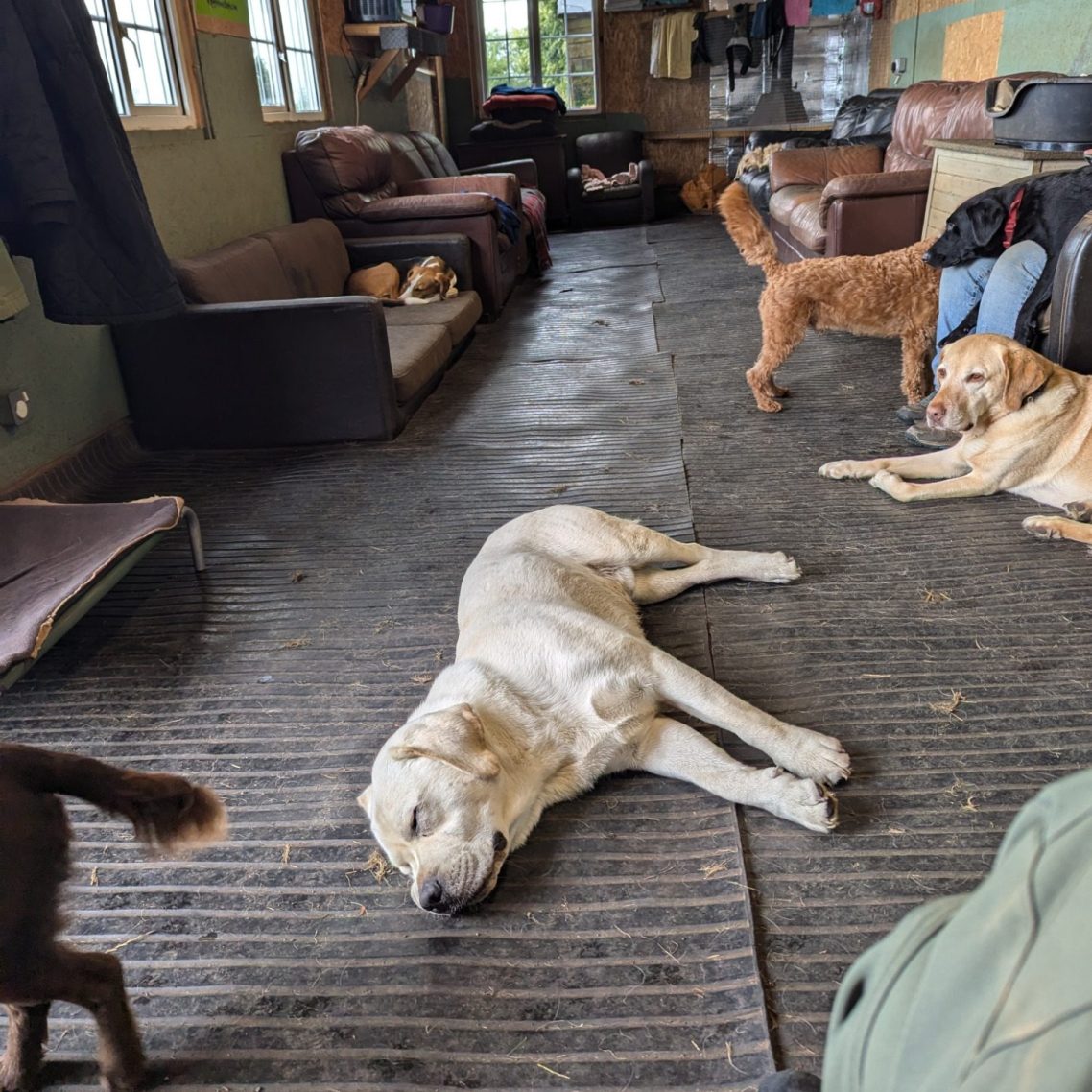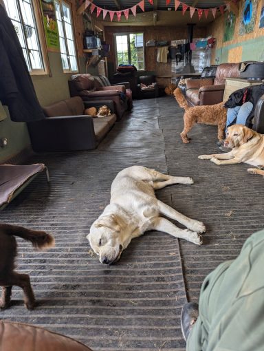 The dog house is an insulated wooden building, full of sofas and dog beds for the dogs to relax. Double glazed and heated with our log burner.