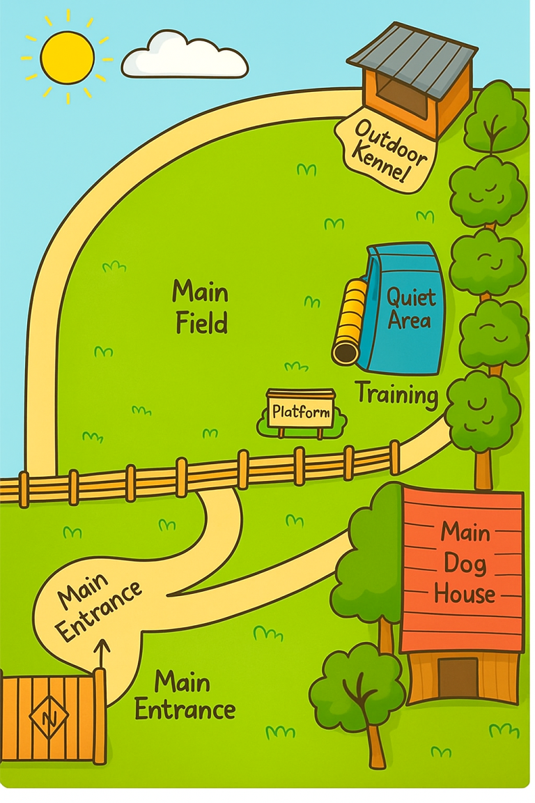 The main field is a large grass field with tunnels and kennels, platforms and obstacles. With balls, ropes, frisbees and paddling pools, this is the main area where dogs run and play.